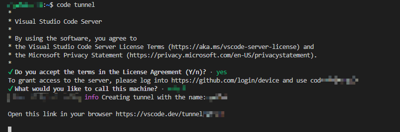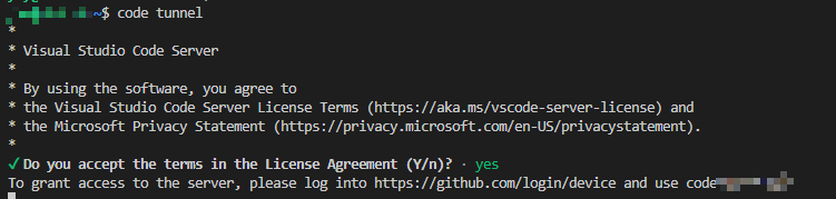 - 先后执行以下命令: - h - ./code tunnel --accept-server-license-terms ![]()