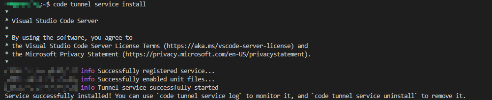 随后- CTRL+C退出该程序,执行下述命令使得 code 以用户服务守护运行:- h - ./code tunnel service install ![]()