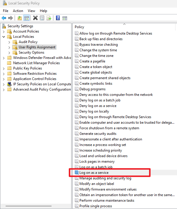 解决方法 https://stackoverflow.com/questions/44604523/error-1069-the-service-did-not-start-due-to-logon-failure-tried-everything- win+R运行- secpol.msc进入本地策略组![]()